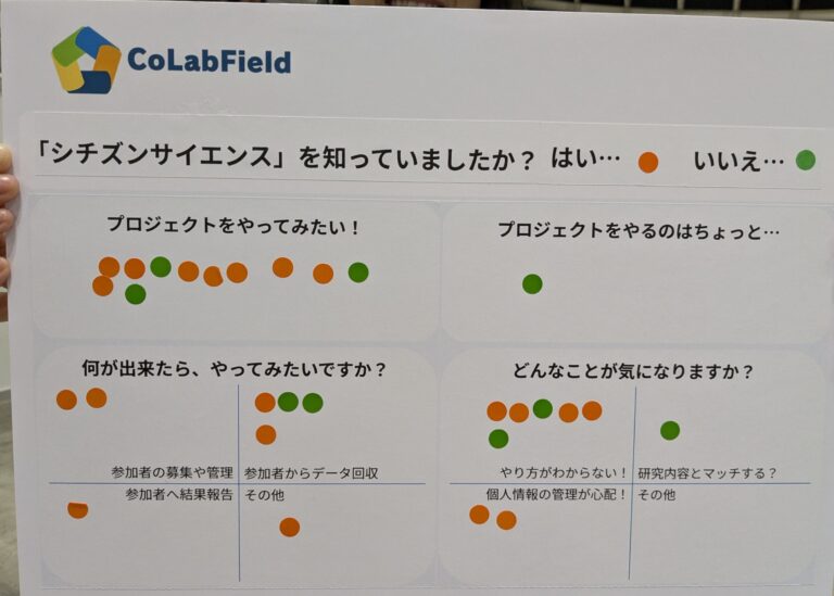 ブースでは、来場者に「シチズンサイエンスを知っているか」「プロジェクトをやってみたいか」「気になる点は何か」等を尋ねる簡易アンケートを実施しました。
