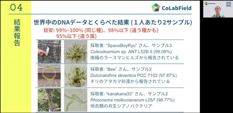 さらに、木の表面や建物の外壁、遊具など、私たちの身近な「気生環境」に生息するシアノバクテリアが、南極や砂漠といった極限環境で見つかるものと遺伝的に近いことも分かりました。日常の風景が、実は極めて過酷な環境である可能性を示す、非常に興味深い発見です。こうした多様性と新規性は、全国各地から集まった参加者のサンプルがあったからこそ見えてきたものです。研究者だけでは到達できなかった視点やデータが、協働によって初めて形になりました。