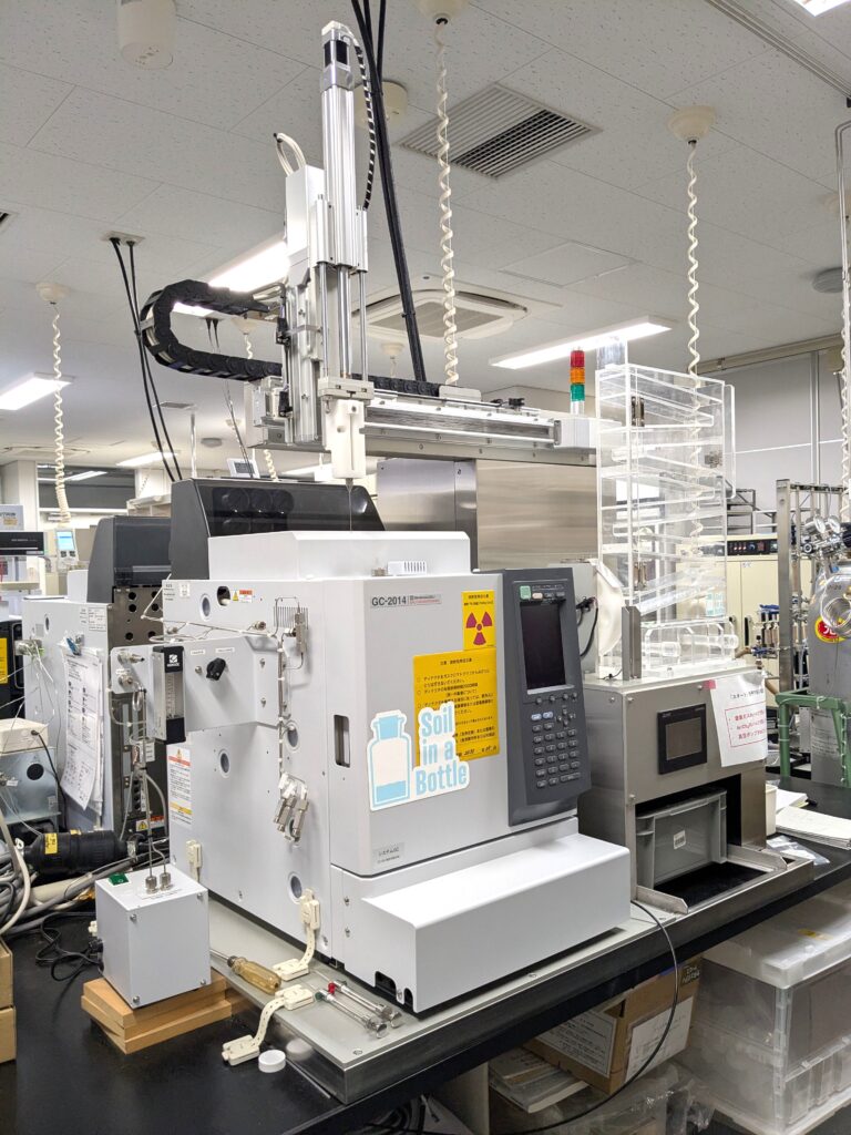 参加者の皆さまから届いた気体と土のサンプルのうち気体サンプルは、ガスクロマトグラフ(通称ガスクロ)による分析機器にかけられます。土の瓶から得られた気体を測定し、N₂Oをはじめとする温室効果ガスの濃度を調べる装置です。一度に最大60本・600分の連続分析が可能なため、大量のサンプルを効率よく処理することができます。
